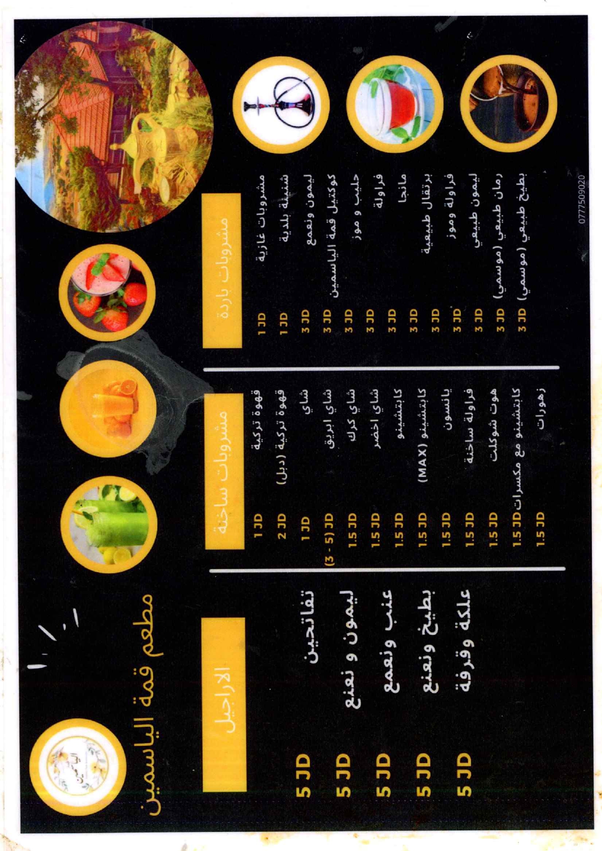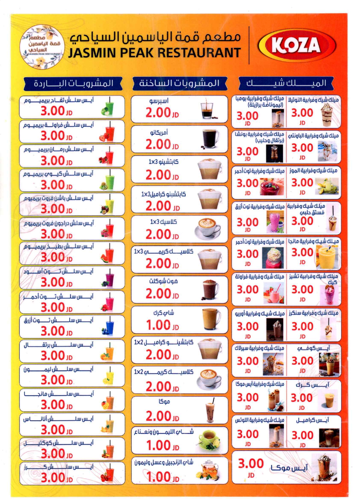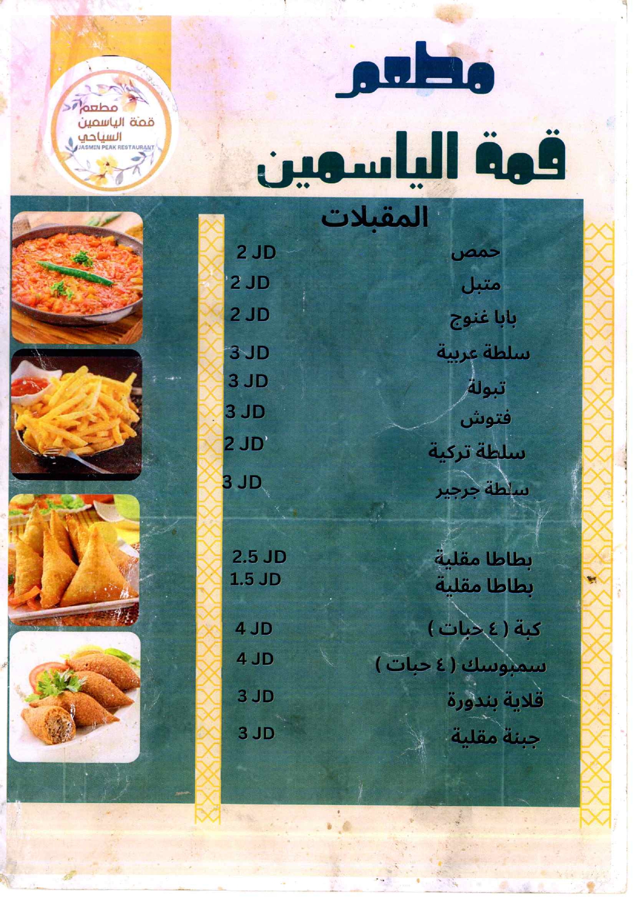 مطعم قمة الياسمين يقدم مختلف انواع المأكولات الاردنية والشرقية المختلفة من مختلف انواع الاطباق الرئيسية والمقبلات الباردة والساخنة والسلطات بالاضافة الى الوجبات الفردية، وكل ذلك باسعار منافسة جدا.